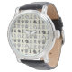 Reloj con diseño de ajedrez con piezas de ajedrez oscuras y claras en filas.