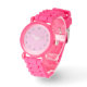 Este reloj presenta una banda de muñeca rosa purpurina con una cara de color rosa. Los números son una plantilla y se pueden eliminar seleccionando "Personalización".