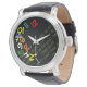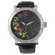 Un reloj conceptual con números de color desordenados y el texto "¿qué hora es?" - se puede editar el diseño y cambiar el color de fondo negro