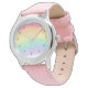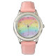 Este reloj tiene una banda de muñeca rosa con un dibujo original de tiza de un arco iris para la cara. Los números son una plantilla y se pueden eliminar seleccionando "Personalización".