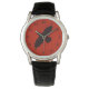 Una silueta simple y negra de un Raven (Corvus corax) sobre una imagen de fondo roja de cuero. La imagen del cuervo ha sido ligeramente "áspera" o "desgastada".