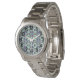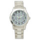 Este reloj de mujeres tiene un diseño moderno de mediados de siglo de rectángulos apilados tres gruesos en colores fríos de azul, verde y morado en un campo de blanco. ¿Quieres el mismo diseño con colores diferentes? Mándame un mensaje.