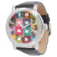 Este reloj masculino tiene un diseño moderno de mediados de siglo de cuadrados con rectángulos redondeados con antena en colores modernos de mediados de siglo. ¿Quieres el mismo diseño en colores diferentes? Mándame un mensaje.