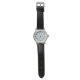 Este reloj masculino tiene un diseño moderno de mitad de siglo de rectángulos verde azulados y grises redondeados en tamaño creciente y decreciente corriendo verticalmente sobre un campo de blanco.