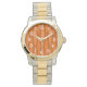 Este reloj masculino tiene un diseño moderno de mediados de siglo de rectángulos redondeados en dos tonalidades de naranja que corren verticalmente sobre un campo marrón. El reloj de mujeres también está disponible.