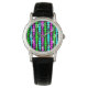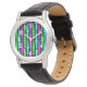 Este reloj tiene un diseño moderno a mediados de siglo de rectángulos de neón rosa, verde y azul redondeados en tamaño creciente y decreciente corriendo verticalmente sobre un campo de negro.