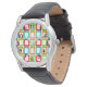 Este reloj masculino tiene un diseño moderno de mediados de siglo de repetición de rectángulos sesgados en rojo, naranja, verde y turquesa.