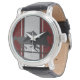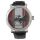 Rojo profundo con dos mostazas con rayas de Carreras en el reloj de correa de cuero negro vintage de los hombres. Excelente regalo de cumpleaños para ese amante de Mustang/Busque nuestras Alfombrillas de auto y otros productos de Mustang. El reloj de cuero vintage para hombre es una pieza de cara grande que nunca pasará de moda. Cuenta con movimiento de cuarzo de tres manecillas y correa de cuero auténtico y tiene un aspecto clásico que lo hace ideal para cualquier ocasión. Personalizar la cara con tu nombre y diseños para hacer que un reloj se ajuste perfectamente a tu personalidad y estilo. Reloj de muñeca masculino Material: Cara: Aleación