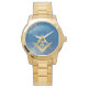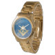 Elegante plaza dorada y brújula con corbata de símbolo masónico Shriners con un fondo azul moderno.