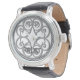 Estar en apuros no siempre te lleva a donde quieres estar o cuando quieres estar. Cuando sea necesario, tómese el tiempo para reflexionar. Este reloj apuesto contiene un patrón plateado de anillos entrelazados y la palabra "reflejar".