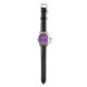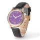 Este reloj femenino tiene un diseño geométrico del Mardi Gras de una especie de óvalos de punta plana que se repiten a lo largo del diseño en oro y verde en un campo de púrpura.