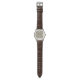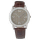 Este reloj masculino tiene un diseño geométrico de una especie de ovales de punta plana que se repite a lo largo del diseño en azul pálido sobre un campo marrón.