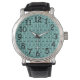 Este reloj masculino tiene un diseño moderno de mediados de siglo de cuadrados con una línea y una línea de círculos, todos negros, repitiendo a través del diseño en un campo de marisco. Si te gusta el diseño pero prefieres colores diferentes, envíame un mensaje.