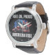 This patriotic wall clock celebrates the spirit of American trucking. It features a vibrant semi-truck adorned with the American flag, set against a dynamic red, white, and blue distressed background. The bold text "ROLL ON, PROUD AMERICAN RIDE" is prominently displayed, making a powerful statement. Framed by a red rim, this clock is a perfect tribute to truck drivers and national pride.