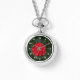 Fotografía de una rosa roja en un jardín. La flor está completamente abierta, exponiendo los tallos amarillos del centro. Detrás de la flor principal crece un par de cuerdas rojas. El fondo está lleno de hojas verdes. Hay un blanco de horas y minutos de reloj para esta foto de la flor. Derechos reservados ©Kimberly J Tilley.