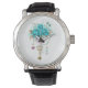 Llave de oro antiguo con rosas turquesa de moda decorados con hojas de oro blanco y cuentas rosas y azules. Color de moda. Rosas turquesas. Oro blanco. Tifanía azul.