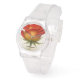 Introducing the clear silicone watch, a contemporary timepiece that combines style and versatility. Beautiful design inside capturing water droplets on a red and yellow rose and crafted with a durable clear silicone strap, this watch ensures comfort for everyday wear. Its sleek design adds a touch of sophistication, making it the perfect accessory for any occasion. Personalize it by adding a name to it!