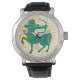 Signo sagitario del zodiaco en verde y blanco en un reloj de pulsera.