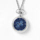 Mira con el cartel del sol de Leo en azul plateado suave, cubierto con las estrellas de la constelación, contra un fondo azul oscuro y estrellado del cielo
