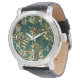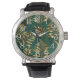 Seamless pattern of gold, jewelry, shiny fern branches and leaves on green, woodland, textured background. Golden fern.