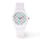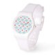 Una moda, reloj de pulsera blanco deportivo, con un patrón de ilimidades de agua rosada y libélulas azules, de un collage de papel pintado a mano de Judy Adamson. Excelente regalo para alguien con un cumpleaños de julio; parte de la colección Posh & Painterly 'Lily Pond'.