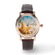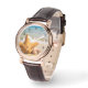 Un reloj con una bonita fotografía de una estrella de mar colocada en la arena. Debajo de sus brazos hay dos pequeñas conchas que descansan cómodamente. Está situado en una playa con olas que rompen en el fondo.