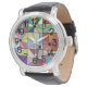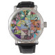 Este reloj masculino tiene un diseño abstracto hecho de nueve cuadrados con un círculo y "rayos" saliendo del círculo en muchos colores diferentes.