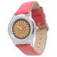 Un diseño muy luminoso y colorido. Un sol estilizado con un centro de espiral y colores llamativos llena toda la cara del reloj. No hay números en la cara. Debido al diseño de las manos, la versión de acero inoxidable puede ser un poco más difícil de leer que los demás estilos.