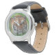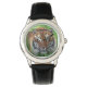 Niños con el clásico reloj de correa de cuero negro mostrado con una foto de tigre exótico de la vida silvestre. Elija este reloj de varios estilos. Personalizar este reloj o compra como está. Imagen de stock