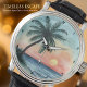 This artistic wall clock features a beautiful illustration of a palm tree silhouetted against a vibrant tropical sunset. The design captures a serene ocean with gentle waves under a colorful sky, evoking a relaxing summer beach landscape. This stylish and artistic timepiece is perfect for interior decor, bringing a calm and vibrant tropical theme to any room.