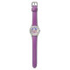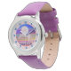 ¡Este es un reloj de bonito que a cualquier niñita le encantaría! Presenta una imagen de unicornio rosa brillante contra un fondo abstracto de estilo iridiscente a rayas azul, púrpura, rosa y amarillo. Su nombre es blanco en la parte inferior izquierda. Los números azules en el borde rosa pálido exterior hacen que el reloj sea fácil de leer. Este diseño se ve genial con varios colores de la banda de muñecas...¡míralos!