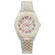 Este reloj de mujeres tiene un diseño moderno de mediados de siglo de flores hechas de cuadrados, óvalos y diamantes que han sido manipulados para formar flores.