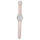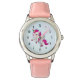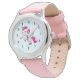 Un reloj con unicornio alado blanco con melena rosa, cola y pezuñas. El cuerno tiene anillos de color arcoiris y se parece a una golosina de caramelo. Este lindo unicornio está criándose en sus patas traseras. El corazón rosado dulce en la mejilla y las largas pestañas de una niña.