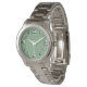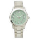 Este reloj de mujeres tiene un diseño art deco de círculos azules y púrpura que se conectan con líneas en un campo de verde claro.