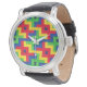 Para los ventiladores de patchwork y de tendedero. Un reloj de pulsera de diseño con correa de cuero vintage y un colcha de tejido con mosaico brillante en la cara; de una foto de un colcha de tela de patchwork, basada en un patrón islámico tradicional, cosido a mano por Judy Adamson.