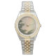 Este hermoso reloj muestra una fotografía de un arcoiris colorido contra un cielo gris. El arcoiris está enmarcado bellamente detrás de un árbol, creando una maravillosa vista de la naturaleza en su más hermosa.