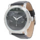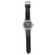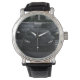 Cierre de un reloj de pulsera. El reloj tiene un funda redondo de color plateado con una banda de cuero negro. La cara del reloj muestra una fotografía de un coche deportivo de color oscuro (probablemente un Lamborghini), situado en el centro y con un enfoque nítido. Otros autos, borrosos, también de color oscuro, son visibles detrás del auto principal, lo que sugiere movimiento o una toma de perspectiva. La imagen de la cara da la impresión de que los coches circulan por una carretera. Las manos vigilantes son visibles pero no prominentes. Todo el reloj se presenta en un fondo blanco y claro, con el foco en el reloj en sí.