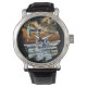 La colorida imagen, en este reloj de pulsera, es de una unidad de "bombeo" de pozos de aceite. Este tipo de unidad asoma y baja, día y noche, trabajando para llevar petróleo y gas natural desde lo profundo hacia la superficie de la tierra.
