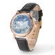 Nubes blancas onduladas en un cielo azul. La cara de reloj básica en negro, muestra guiones por minutos, más grande por intervalos de cinco minutos.
