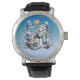 Charming winter illustration with a smiling snowman, striped scarf, blue mug of cocoa, boots and pine accents. Soft blue palette, warm accents, and cozy season feel!