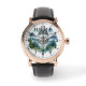 This men's rose gold color vintage watch is shown with a wolf watercolor print.