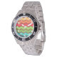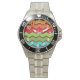 Este reloj tiene un diseño retro de los años 70 de líneas horizontales de zigzag en amarillo, naranja, rojo, verde y azul sobre un campo de marrón.