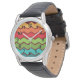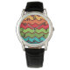 Este reloj tiene un diseño de los años 70 de líneas de zigzag en amarillo, naranja, rojo, verde y azul en un campo de marrón.