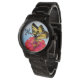 Mariposa en zinnia, reloj de pulsera inspirado en la naturaleza. El fondo azul del cielo y la mariposa de cola tragada comiendo de una flor de zinnia roja brillante es la imagen con un lugar para su primer nombre inicial. Se muestra con una banda negra o elige entre los muchos otros colores y diseños. Perfecto para una mujer jardinero y/o amante de la naturaleza.