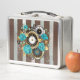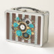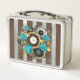 Reloj de época con estampado, adornado con joyas, manos de la hora de oro y números latinos con rosas turquesa sobre fondo marrón y rayas. Estilo Steampunk.