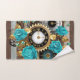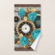 Reloj de época con estampado, adornado con joyas, manos de la hora de oro y números latinos con rosas turquesa sobre fondo marrón y rayas. Estilo Steampunk.