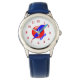 El reloj de un chico divertido, con gráficos de un rayo rojo y azul de iluminación en un disco rojo, contra un fondo blanco, decora el medio de la cara del reloj. Números rojos para las horas y texto azul personalizado, está listo para personalizar para tu propio pequeño Super Hero.