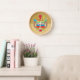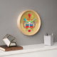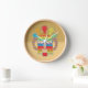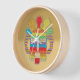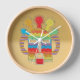Reloj de pared en la elección de acabados de corte, incluyendo acrílico y madera, una variedad de colores como negro, blanco y madera natural. El reloj puede ordenarse como redondo o cuadrado, en varios tamaños, y las manos pueden ordenarse como blancas o negras. NOTA: La obra de arte NO está tejida sino que es una impresión de una máscara inca tejida. Se ejecuta en una batería AA (no incluida)
