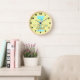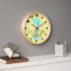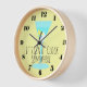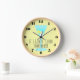 Es Gin o'Clock en algún lugar, escrito con letras mayúsculas modernas, en un reloj con una cara amarilla y números negros fáciles de ver, bajo un dibujo de un cóctel de vidrio con gin y tonic, hielo y limón. Es ideal para una cocina o una zona de bar.