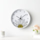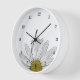 Reloj floral del Condado Rústico con un moderno diseño de margarita blanca sobre un fondo blanco. Los números negros te dan el tiempo de darte una adición botánica a tu decoración de casa.